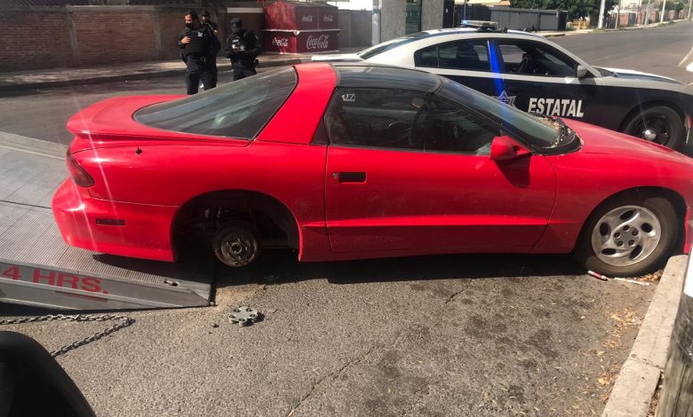 Al acudir al lugar, policías estatales pudieron constatar que el vehículo Firebird, TransAm, con placas RPU-770-A para Nuevo León, se encontraba sobre tabiques en su eje trasero, sin los dos neumáticos, seguros desactivados y estero faltante, por lo que indagaron en los alrededores sin que obtuvieron información del propietario, por lo que se solicitó el servicio de una grúa para resguardar el vehículo en el corralón y así evitar que siguieran desarmándolo.