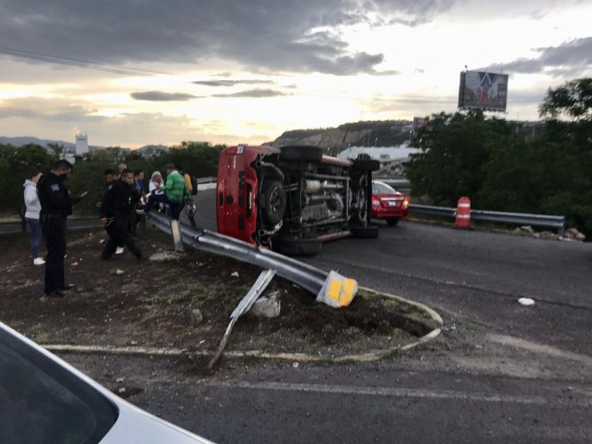Una aparatosa volcadura se presentó esta noche, sobre el Blvd Bernardo Quintana en su incorporación a 5 de Febrero en dirección al sur, en donde el conductor de una camioneta RAM 4×4, con placas para Guanajuato, intentó ganarle el paso a un tráiler de doble remolque y terminó volcando después de recibir el choque por la parte trasera de la pesada unidad que no alcanzó a ver cuando la camioneta le cortaba el paso.