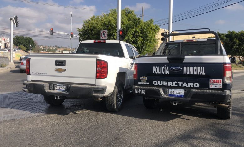 Esta mañana se presentó un hecho de tránsito entre una patrulla de la policía municipal y una camioneta particular en el cruce de Av de la Luz y Vesubio, al norte de la capital, en la colonia Satélite