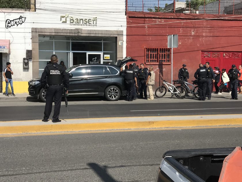 Policía revisa a escoltas afuera de sucursal de Bansefi