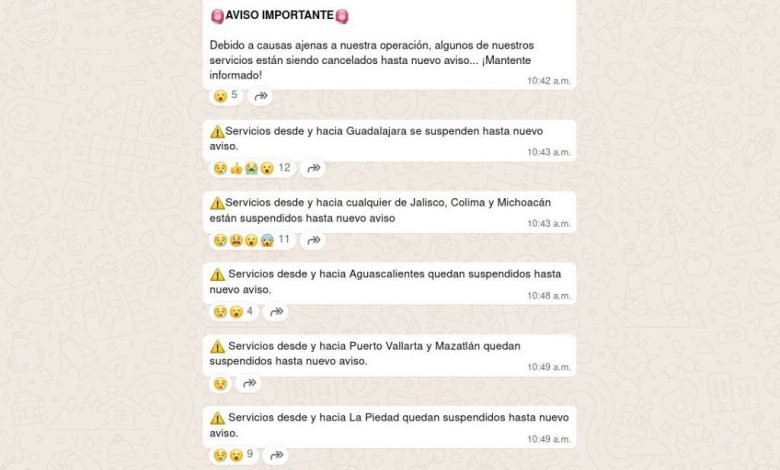 De acuerdo con avisos difundidos por la compañía, quedaron suspendidos servicios hacia Guadalajara y otros destinos de Jalisco , Colima, Michoacán, Aguascalientes y Sinaloa.