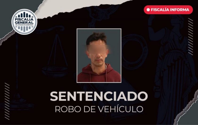 La Fiscalía de Querétaro obtuvo sentencia condenatoria en contra de Juan Enrique “N”, por el delito de robo de vehículo, derivado de hechos ocurridos el 15 de julio de 2025, en la colonia Loma Linda, en la capital del estado.