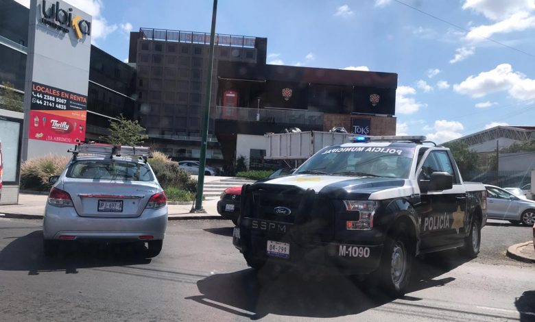 Policías municipales resguardan la lateral de Av 5 de Febrero y Av Universidad, en dirección a SLP. en donde toman conocimiento del deceso de una persona, quien aparentemente cayó, desde el puente superior vehicular de 5 de Febrero; a laterales de la vialidad.