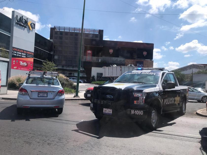 Policías municipales resguardan la lateral de Av 5 de Febrero y Av Universidad, en dirección a SLP. en donde toman conocimiento del deceso de una persona, quien aparentemente cayó, desde el puente superior vehicular de 5 de Febrero; a laterales de la vialidad.