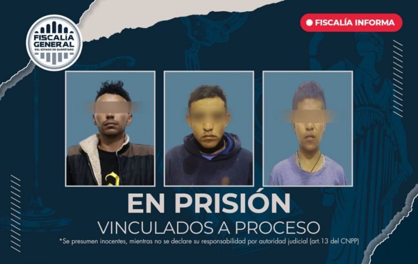 La Fiscalía de Querétaro obtuvo la vinculación a proceso de tres hombres por su probable coautoría en el delito de robo equiparado de vehículo, luego de ser detenidos en flagrancia con el apoyo de la Secretaría de Seguridad Pública Municipal de Querétaro.