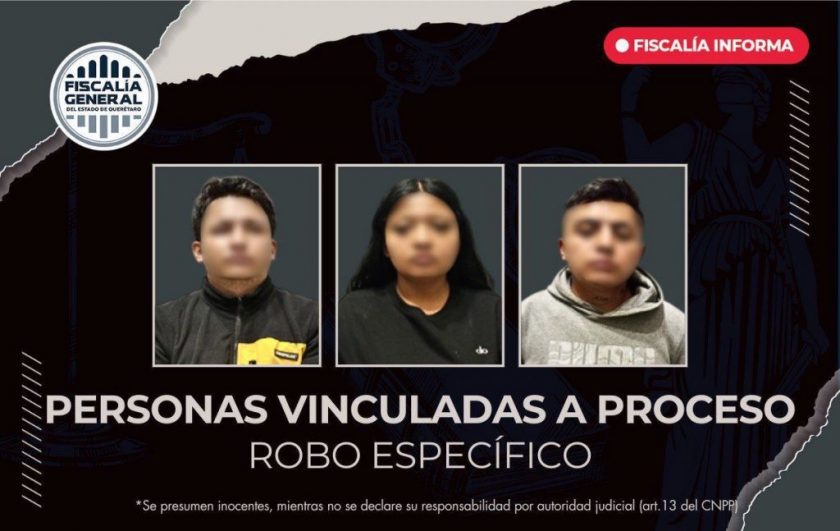 La Fiscalía de Querétaro obtuvo la vinculación a proceso de tres personas —dos hombres y una mujer— por su probable intervención en el delito de robo específico, cometido en agravio de una tienda ubicada en la comunidad de Villa Progreso, municipio de Ezequiel Montes.