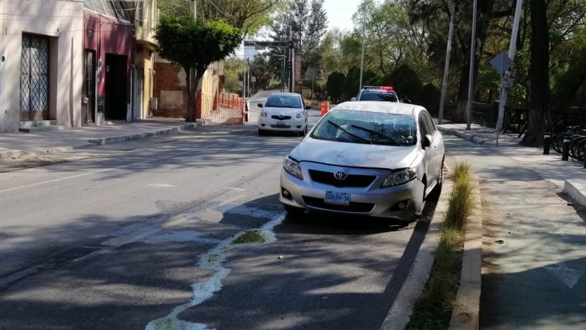 El conductor de un vehículo tipo Corolla se dirigía sobre Av Universidad con dirección a 5 de Febrero, cuando a la altura de la Plaza de los Patitos, alcanzó a golpear la estructura de la ciclovía y provocó que terminara volcando.