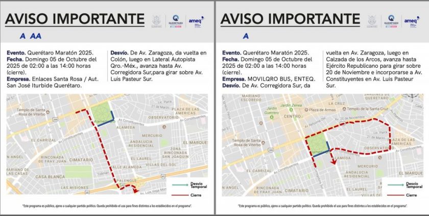 Los ajustes se aplicarán conforme a los cierres viales programados por los organizadores. El sábado 4 de octubre, los desvíos serán de 9:00 a 18:00 horas, mientras que el domingo 5 de octubre se extenderán de 2:00 a 14:00 horas.