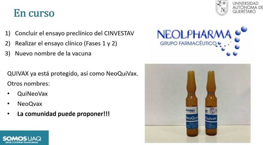 “Cuando intentamos patentar el nombre de la vacuna, ya ve que se patentan los nombres nos llevamos la sorpresa de que el nombre de Quivax ya está patentado, le quisimos poner NeoQuivax pero también está protegido”, reconoció el investigador, quien invitó a la comunidad universitaria a proponer nuevos nombres para la nueva vacuna de la UAQ.