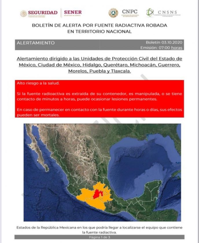 # InformaciónImportante La Comisión Nacional de Seguridad Nuclear y Salvaguardias @CONASENUSA informa que a las 4:00 hrs del día 3 de octubre se reportó el robo de un equipo de radiografía industrial en la Autopista Calpulalpan-Texcoco , #EdoMex. El material es considerado muy peligroso.