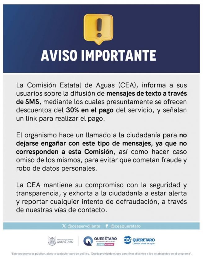 La Comisión Estatal de Aguas (CEA) emitió una advertencia a sus usuarios ante la circulación de mensajes de texto enviados vía SMS, en los que se ofrecen presuntos descuentos del 30 por ciento en el pago del servicio e incluyen un enlace para realizar la transacción.