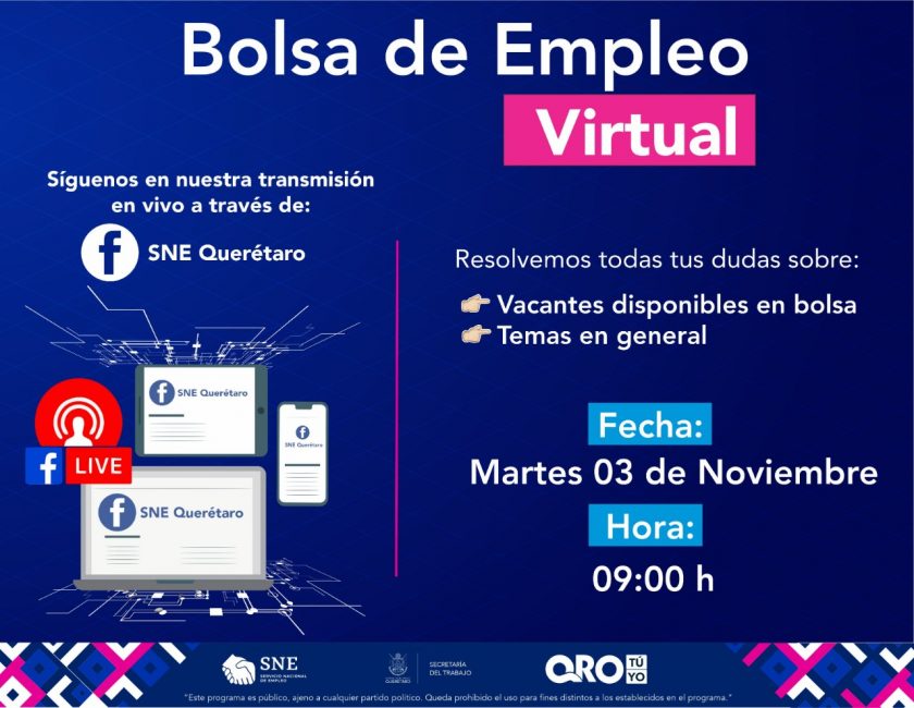 Esta Bolsa de Empleo se transmitirá por Facebook Live en el perfil del Servicio Nacional de Empleo Querétaro, a partir de las 9:00 horas.