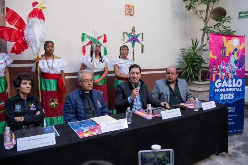 El presidente municipal de El Marqués, Rodrigo Monsalvo Castelán, y el vocero de la Diócesis de Querétaro, José Martín Lara Becerril, presentaron la edición 2025 del Gallo Monumental, que se llevará a cabo el 25 de octubre con la expectativa de reunir a 20 mil asistentes.