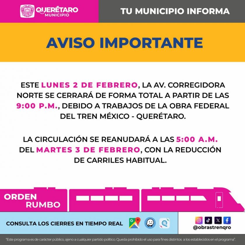 La circulación en avenida Corregidora Norte será cerrada en su totalidad la noche de este lunes 2 de febrero, a partir de las 21:00 horas, como parte de los trabajos relacionados con la obra del Tren México–Querétaro, informó el Municipio de Querétaro.