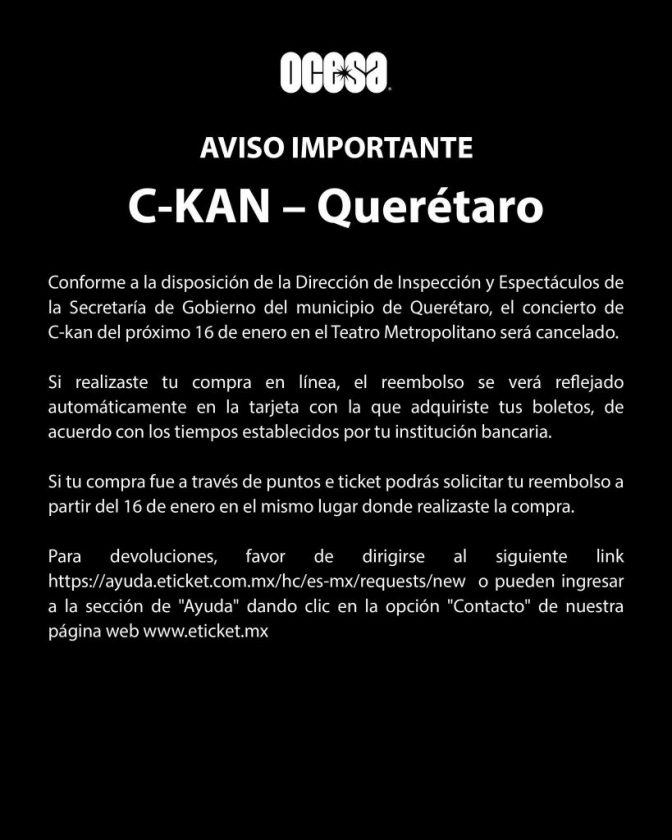 A través de un comunicado oficial, el Municipio de Querétaro informó la cancelación del concierto del cantante C-Kan, programado para el viernes 16 de enero de 2026 en el Teatro Metropolitano, al determinar que el evento incumplía con el Reglamento de Espectáculos vigente.