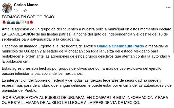 El alcalde Carlos Manzo solicitó la intervención del Gobierno Federal para atender la situación de violencia. “La intervención del Gobierno Federal no puede esperar más”, declaró el edil.
