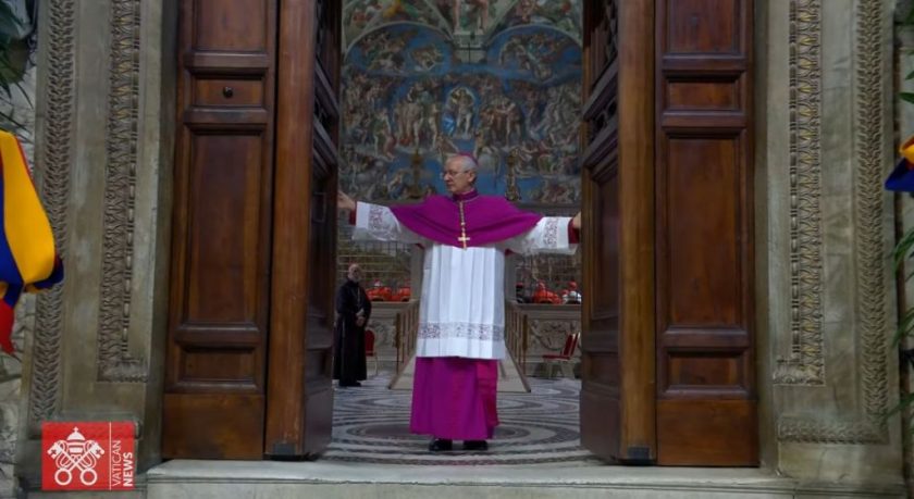 Posteriormente, Mons. Ravelli dio la orden de “Extra Omnes” (“Todos fuera”), que selló el inicio oficial del Cónclave al cerrar las puertas de la Capilla Sixtina custodiadas por los guardias suizos.