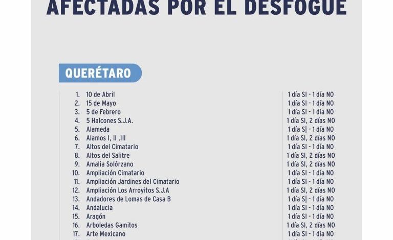 La Comisión Estatal de Aguas publicó la lista de colonias que se verán afectadas por la suspensión de operaciones del sistema Acueducto II, derivado del desfogue de la presa Zimapán. Más de 300 fraccionamientos y comunidades recibirán servicio de forma tandeada en tanto se normaliza el servicio.
