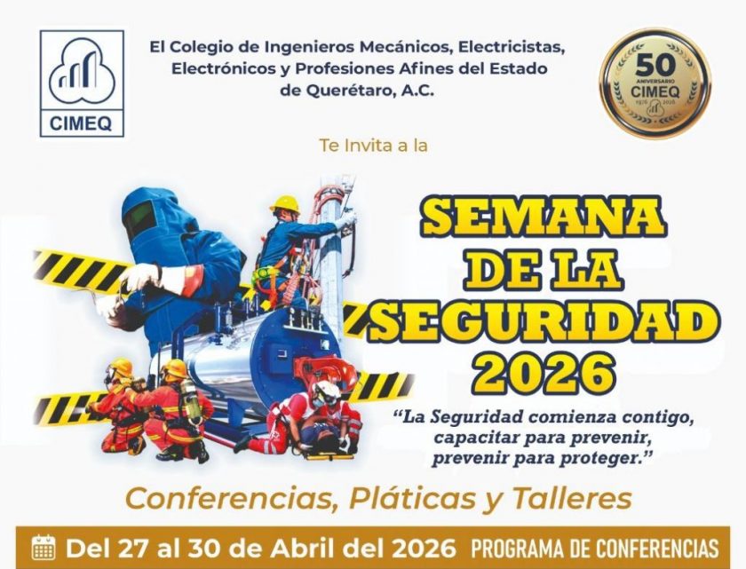 El Colegio de Ingenieros Mecánicos, Electricistas, Electrónicos y Profesiones Afines del Estado de Querétaro (CIMEQ) realizará la Semana de la Seguridad 2026 del 27 al 30 de abril, con un programa de capacitación enfocado en prevención de riesgos y actualización técnica.