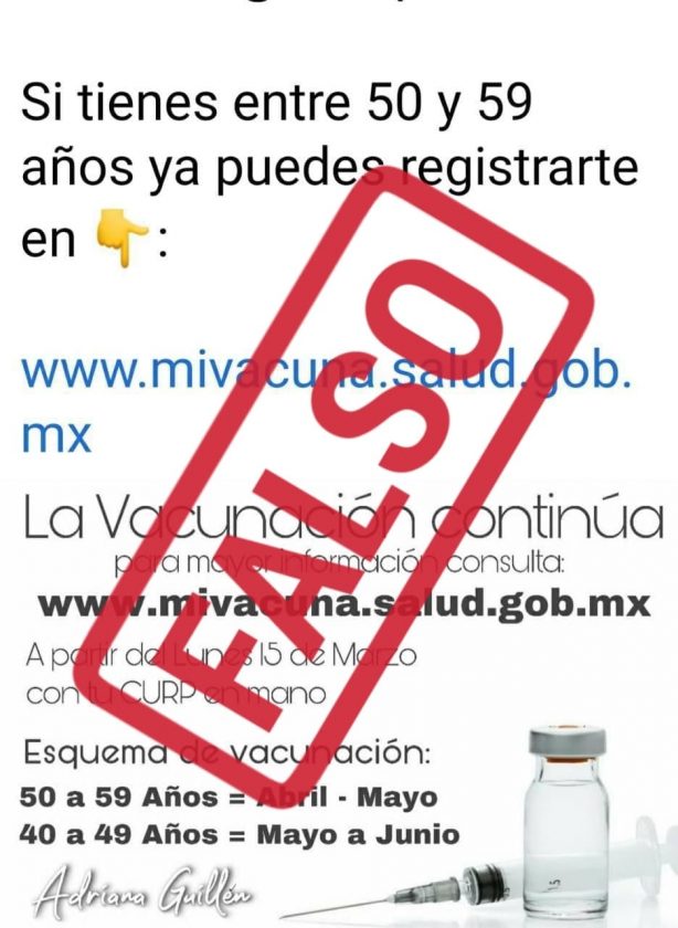 En redes sociales circula una imagen falsa para el registro de personas de 50 y 59 años para la vacuna anticovid en México.