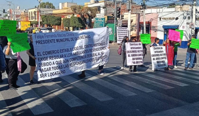 Un grupo de comerciantes establecidos del Centro Histórico, se manifestaron con lonas y pancartas sobre Avenida Zaragoza, en su intersección con la calle de Allende para exigir que se retire a los comerciantes ambulantes, por considerar que a pesar de las medidas iniciadas por el municipio de Querétaro, continúan en las calles como una competencia desleal para sus negocios.