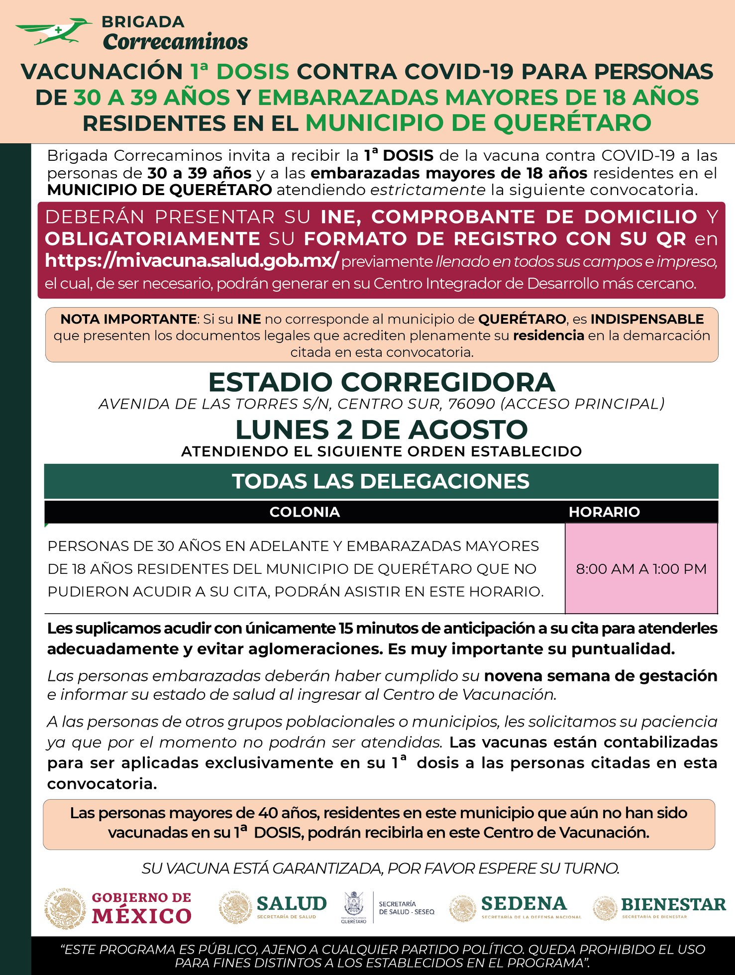 La Brigada Correcaminos convocó a recibir la primera dosis de la vacuna contra Covid-19 a las personas de 30 a 39 años y embarazadas de 18 años en adelante, que vivan en las delegaciones capitalinas Felipe Carrillo Puerto, Josefa Vergara y Hernández y Félix Osores Sotomayor.