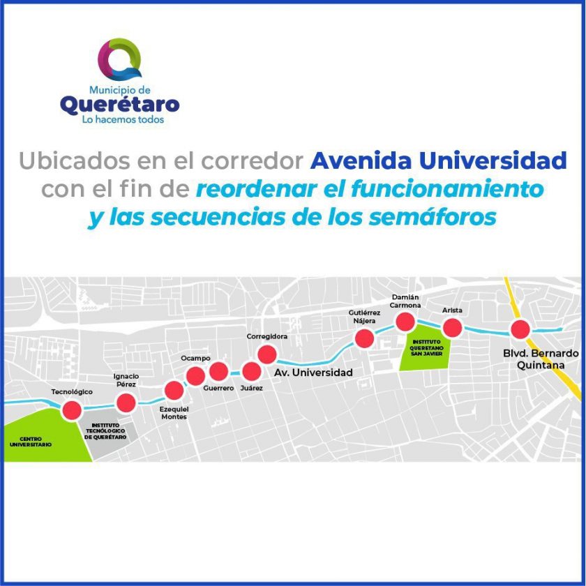 A fin de agilizar tiempos de traslado y optimizar el flujo vehicular, a partir de hoy la Secretaría de Movilidad del Municipio de Querétaro realizará trabajos en la infraestructura de los semáforos ubicados sobre avenida Universidad.