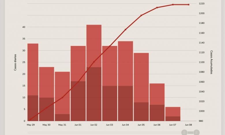 De hecho, en las gráficas publicadas en datos.covid-19.conacyt.mx no hay registros de casos nuevos para el día 8 de junio, aunque en el reporte estatal se da cuenta de 39 casos nuevos de la enfermedad.