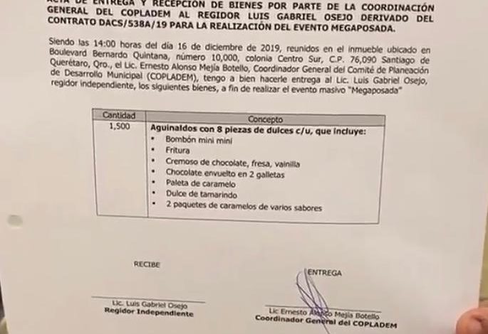 A través de las redes sociales, el regidor Independiente, Luis Gabriel Osejo Domínguez, denunció un acto de corrupción al interior de la administración municipal de Querétaro, al explicar que le solicitan su firma para una supuesta entrega de mil 500 aguinaldos que le habría entregado el Comité de Planeación para el Desarrollo Municipal (COPLADEM).