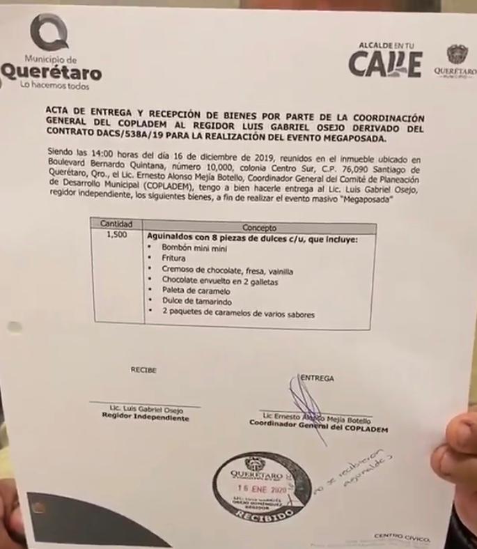A través de las redes sociales, el regidor Independiente, Luis Gabriel Osejo Domínguez, denunció un acto de corrupción al interior de la administración municipal de Querétaro, al explicar que le solicitan su firma para una supuesta entrega de mil 500 aguinaldos que le habría entregado el Comité de Planeación para el Desarrollo Municipal (COPLADEM).