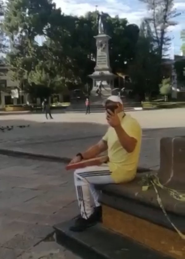 Circula en redes sociales la agresión a personal que labora como vigilante ciudadano en la zona centro de la capital, en el video se observa a una persona del sexo masculino, sentado en una de las bancas del jardín Corregidora, donde después de quitar los cordones, se sentó para esperar y después consumir su pizza.