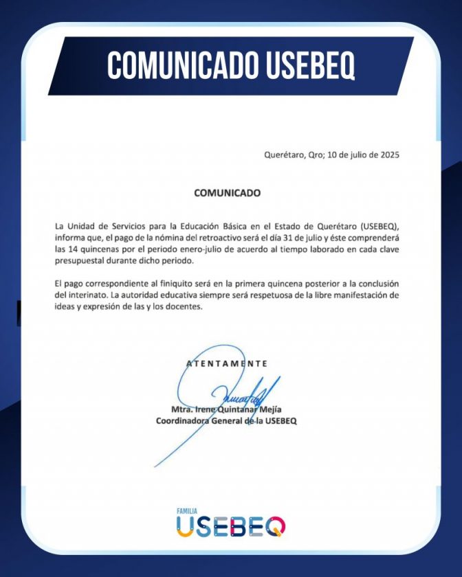 Tras protestas de maestros, la USEBEQ confirmó que el pago retroactivo para docentes se realizará el 31 de julio, informó Irene Quintanar, coordinadora general.