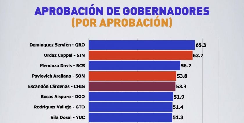 En total hay cinco gobernadores con un nivel de aprobación superior al de Andrés Manuel López Obrador (52.7%). Claudia Pavlovich, de Sonora (53.8%), y Rutilio Escandón, Chiapas (53.3%) completan el “Top 5”.