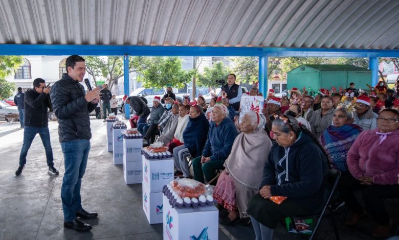 El presidente municipal de El Marqués, Rodrigo Monsalvo Castelán, encabezó la entrega de despensas y paquetes navideños a personas adultas mayores en la comunidad de Amazcala, como parte del programa municipal de apoyo alimentario que impulsa el Sistema Municipal DIF (SMDIF).