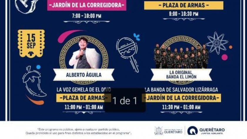 El lunes 12 de septiembre en el Jardín de la Corregidora se presentarán las agrupaciones de La Sonora Santanera y la Sonora Dinamíta, quienes de 7 de la tarde a 10 de la noche ofrecerán un concierto. El día siguiente, de 9 a 11 pm, en el mismo recinto, el cantante Enrique Guzmán hará lo propio.