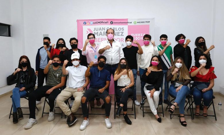 El candidato de Fuerza por México a la gubernatura de Querétaro, Juan Carlos Martínez, se reunió con estudiantes de la UAQ, Universidad Anáhuac y el Instituto Tecnológico de Monterrey donde escuchó las inquietudes de los jóvenes y sus necesidades para integrar su plataforma de gobierno para los próximos seis años.