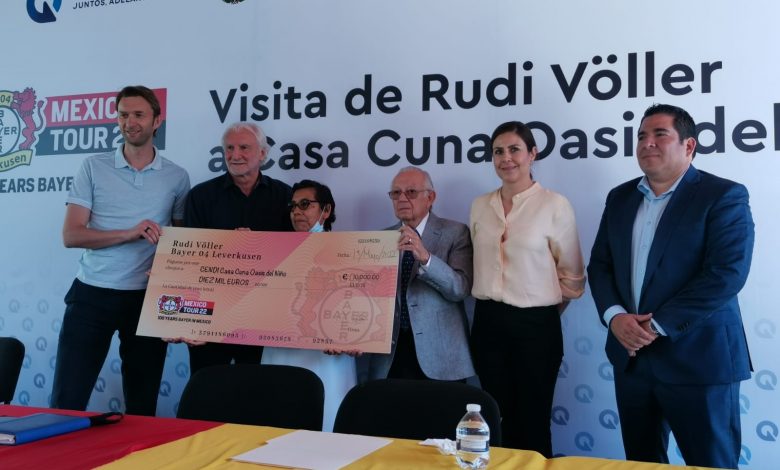 El legendario ex jugador alemán, Rudi Voller, quien participó en la Copa del Mundo 1986, entregó un donativo por 10 mil euros a la Casa Cuna Oasis del Niño ubicada en el Centro Histórico de Querétaro, como parte de la gira que realiza el Bayer Leverkusen en México.