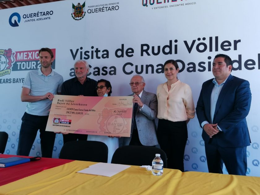 El legendario ex jugador alemán, Rudi Voller, quien participó en la Copa del Mundo 1986, entregó un donativo por 10 mil euros a la Casa Cuna Oasis del Niño ubicada en el Centro Histórico de Querétaro, como parte de la gira que realiza el Bayer Leverkusen en México.