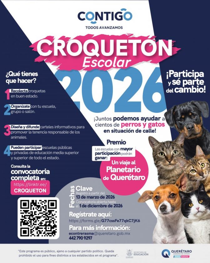 La Secretaría de Educación del Estado de Querétaro (SEDEQ) abrió la convocatoria para la segunda edición del Croquetón Escolar 2026, una colecta de alimento para perros y gatos en situación de calle dirigida a estudiantes de bachillerato y universidades públicas y privadas.