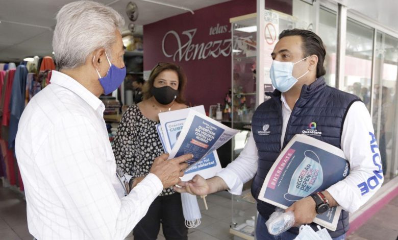 El Presidente Municipal de Querétaro, Luis Nava, visitó a los comerciantes de Plaza las Américas para invitarlos a sumarse a la campaña de concientización sobre el uso de cubreboca y el respeto a las medidas de prevención del COVID-19, que se realiza en conjunto con la Delegación Centro Histórico, la Cámara Nacional de Comercio (CANACO), la Cámara Nacional de la Industria Restaurantera y Alimentos Condimentados (CANIRAC), y la Asociación de Comerciantes del Centro Histórico.