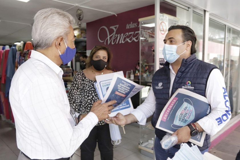 El Presidente Municipal de Querétaro, Luis Nava, visitó a los comerciantes de Plaza las Américas para invitarlos a sumarse a la campaña de concientización sobre el uso de cubreboca y el respeto a las medidas de prevención del COVID-19, que se realiza en conjunto con la Delegación Centro Histórico, la Cámara Nacional de Comercio (CANACO), la Cámara Nacional de la Industria Restaurantera y Alimentos Condimentados (CANIRAC), y la Asociación de Comerciantes del Centro Histórico.