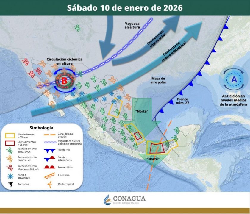 Asimismo, el SMN reportó que el frente frío provocará un evento de “Norte” intenso con rachas de 100 a 120 km/h en la costa de Veracruz y oleaje de hasta 5 metros de altura en el Golfo de Tehuantepec.