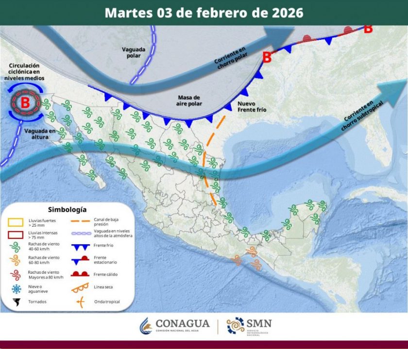 Para el miércoles 04 de febrero, se prevén chubascos con lluvias puntuales fuertes, de entre 25 y 50 milímetros, principalmente en la región de la Sierra Gorda del estado, como resultado de la interacción del sistema frontal con canales de baja presión y el ingreso de humedad del océano Pacífico.