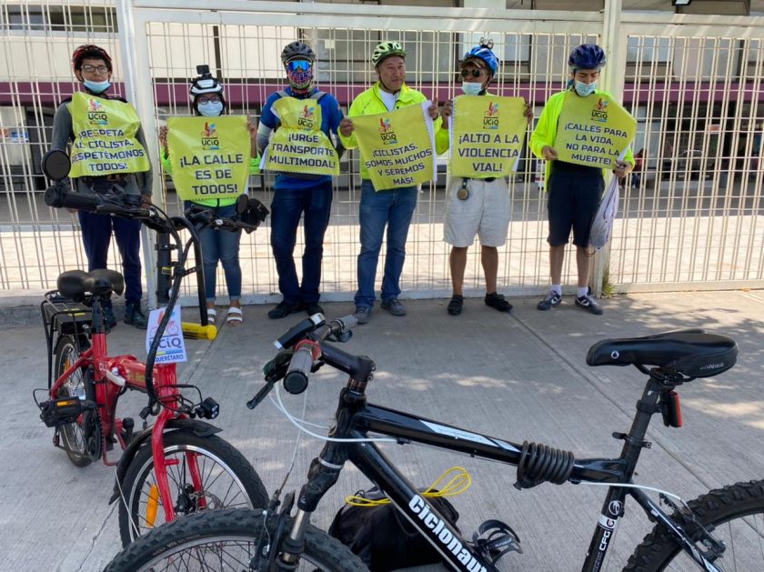 la UCIQ hizo presencia en las inmediaciones del Instituto Queretano del Transporte, donde buscan ser visibles a todas las dependencias involucradas en la Movilidad en Querétaro “Lo que se busca el día de hoy pues es que de alguna forma seamos más visibles, ya somos visibles los ciclistas organizados, pero queremos que la autoridad vea qué hay una necesidad real en la ciudad, qué hay mucha gente usa la bicicleta como un transporte y que la ciudad no está completamente lista, está iniciando, esta avanzando, poco a poco, pero hace falta mucha educación, hace falta aplicación al reglamente de tránsito municipal y estatal, hace falta que la educación permee desde las escuelas primarias, que llegue a los automovilistas y que haya una cultura de respeto entre todos los que andamos en la vía pública”, manifestó el vocero de la UCIQ.