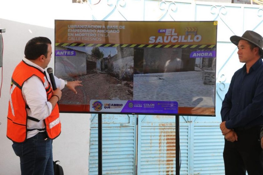 El presidente municipal de Colón, Gaspar Trueba Moncada, encabezó la inauguración de la urbanización de la Calle Fresnos, en la comunidad de El Saucillo, obra que incluyó empedrado ahogado en mortero y trabajos de infraestructura hidráulica.