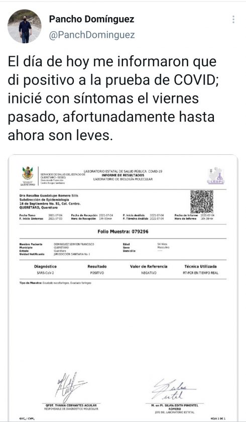 Domínguez Servién hizo el anuncio a través de sus redes sociales, en las que mostró el resultado a la prueba por el virus SARS-CoV-2.