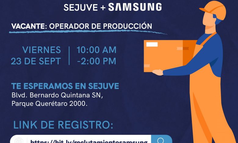 La contratación es directa para iniciar a laborar el 26 de septiembre; las y los interesados deberán realizar su registro previo en: https://bit.ly/reclutamientosamsung y asistir con currículo impreso.