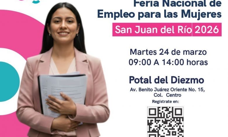 La Secretaría del Trabajo (ST) invita a la Feria Nacional de Empleo para las Mujeres 2026, en la primera edición que se llevará a cabo en el municipio de San Juan del Río, el próximo martes 24 de marzo, de 09:00 a 14:00 horas, en el Portal del Diezmo.