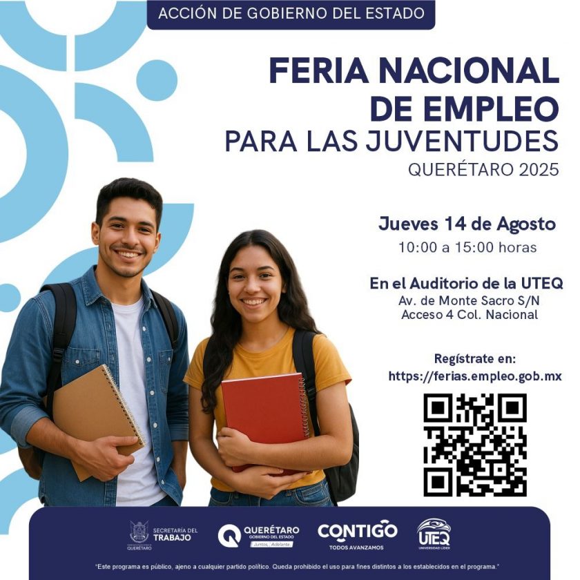 La Secretaría del Trabajo (ST), que encabeza Liliana San Martín Castillo, invita a la ciudadanía a participar en la Feria Nacional de Empleo para las Juventudes 2025 donde se ofertarán más de mil vacantes, el próximo 14 de agosto en el auditorio de la Universidad Tecnológica de Querétaro UTEQ, ubicada en la colonia Nacional en un horario de 10:00 a 15:00 horas.