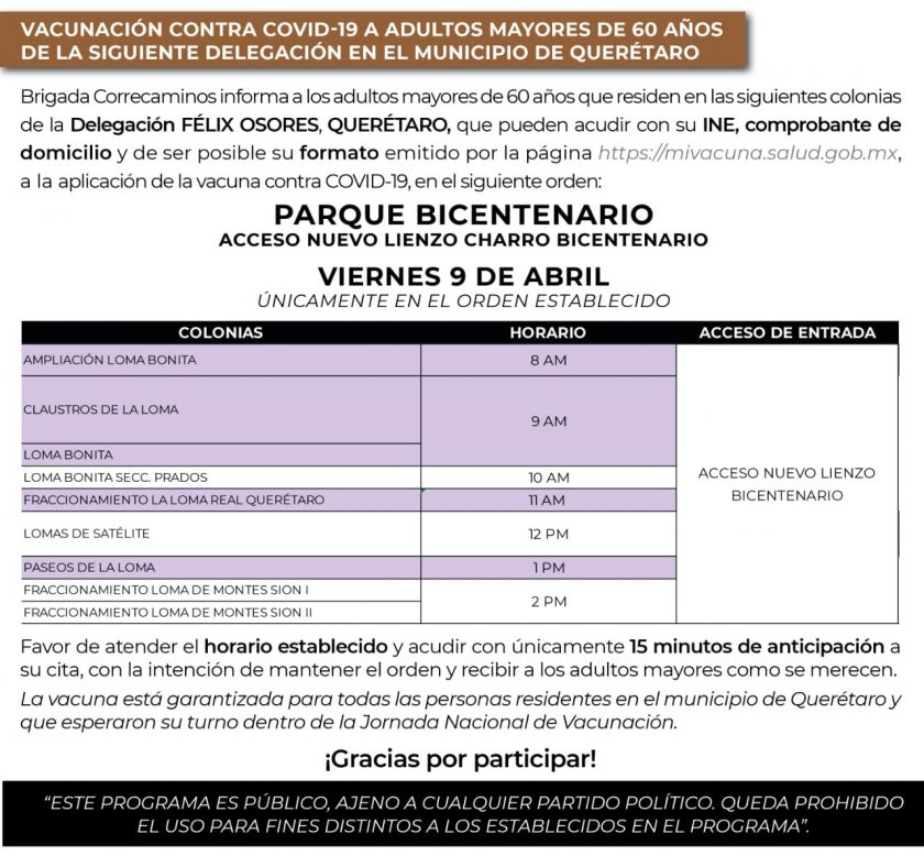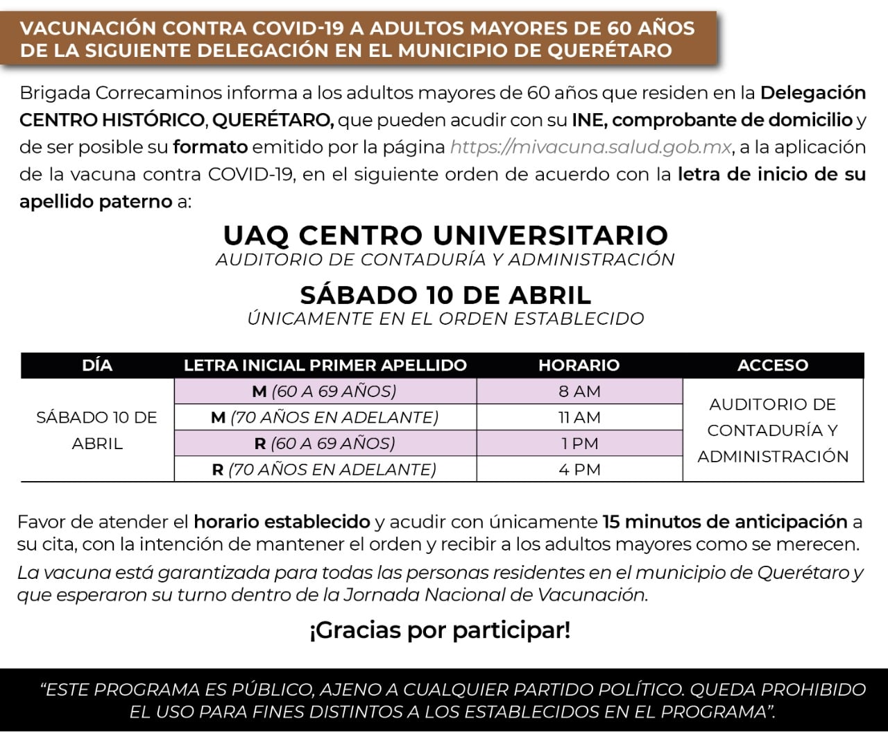 La Secretaría de Bienestar publicó la convocatoria para la vacunación contra covid-19 dirigida a los adultos mayores de las delegaciones Centro Histórico, Felipe Carrillo Puerto y Félix Osores Sotomayor para los días 9, 10 y 11 de abril.
